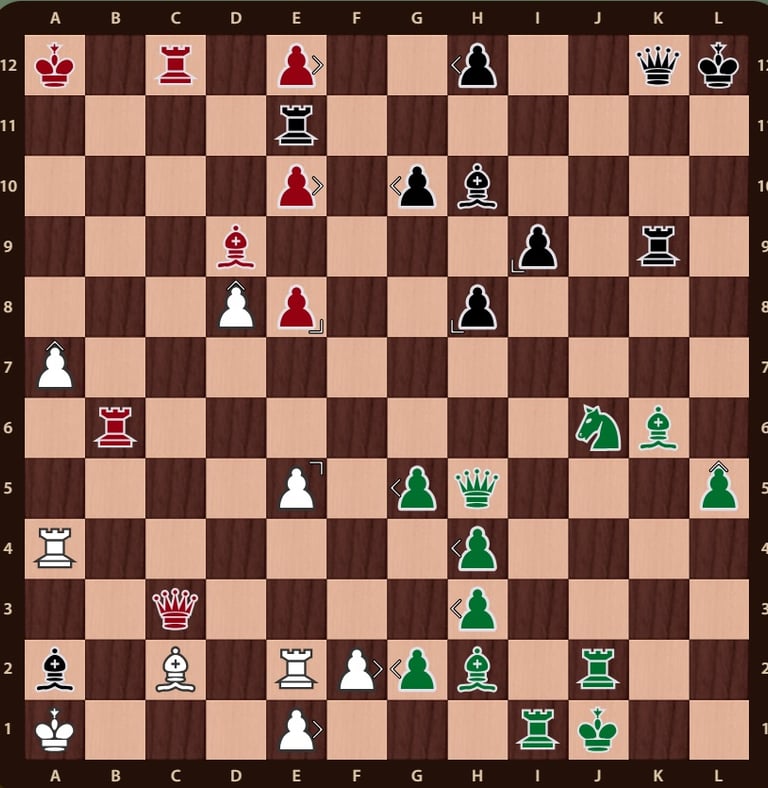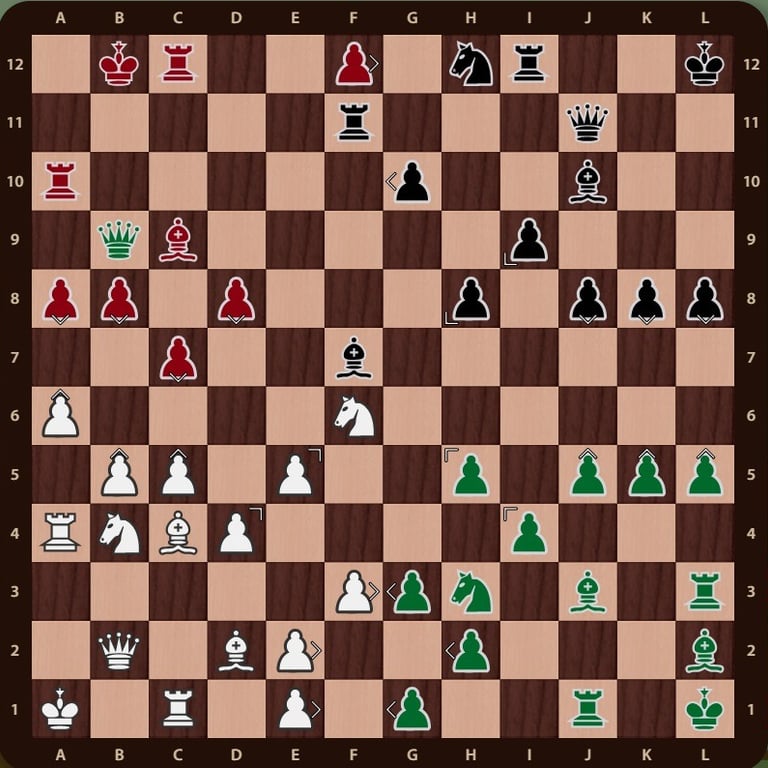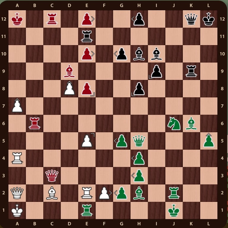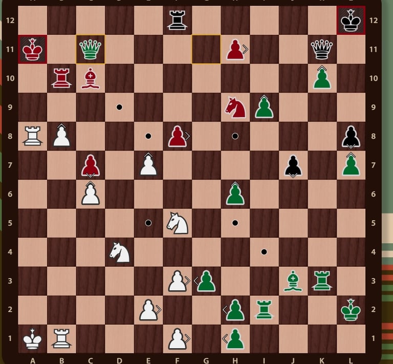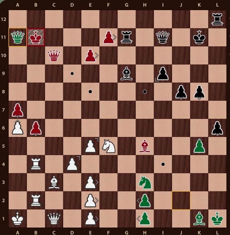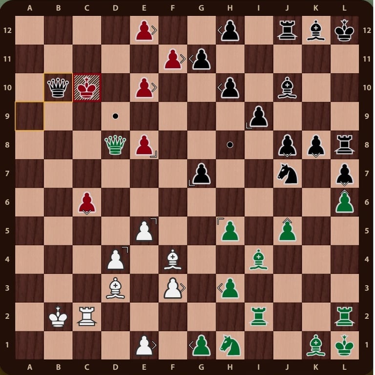 El rey rojo( no esta en jaque mate porque el ejercito negro esta inactivo y la torre de f12 no impide que el rey rojo pueda ir a la casilla b12) esta rodeado, falta un movimiento para completar el jaque mate, la reina verdeen c11 cubre la casilla de escape del rey rojo y completa el jaque mate