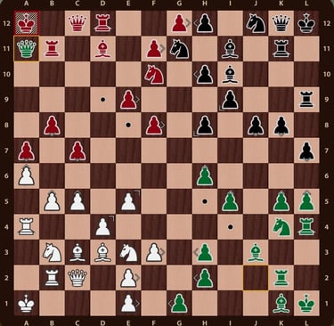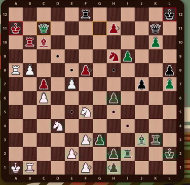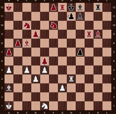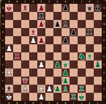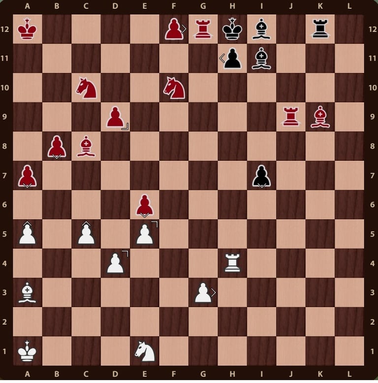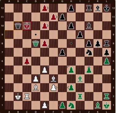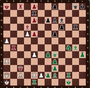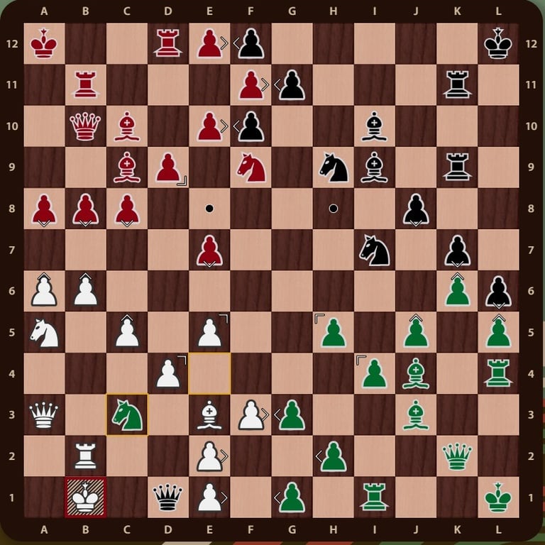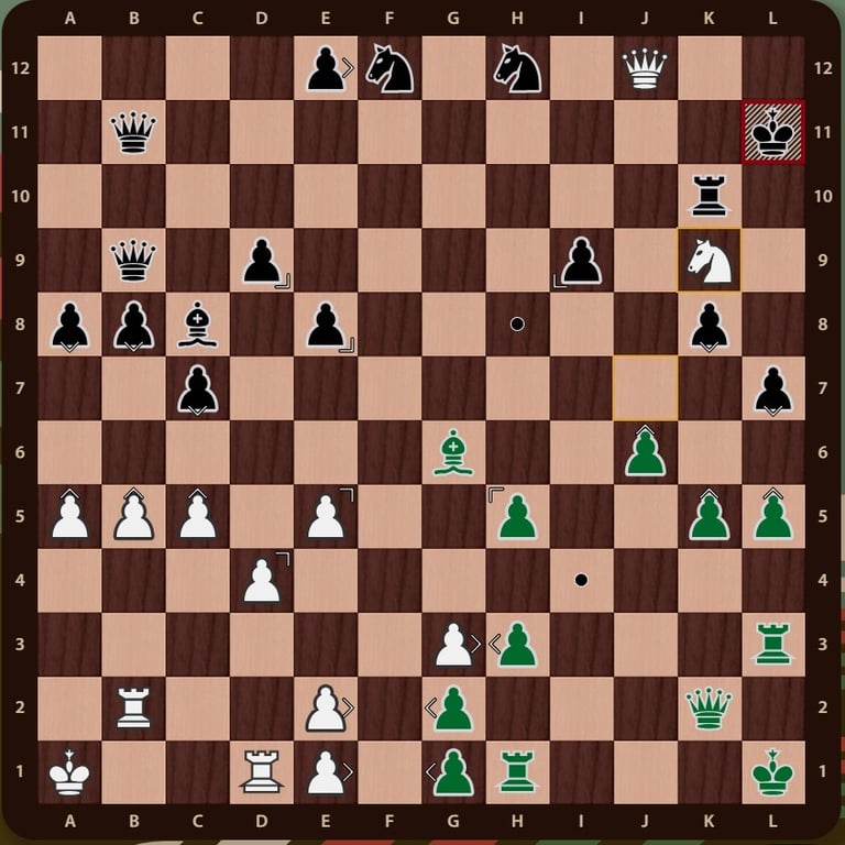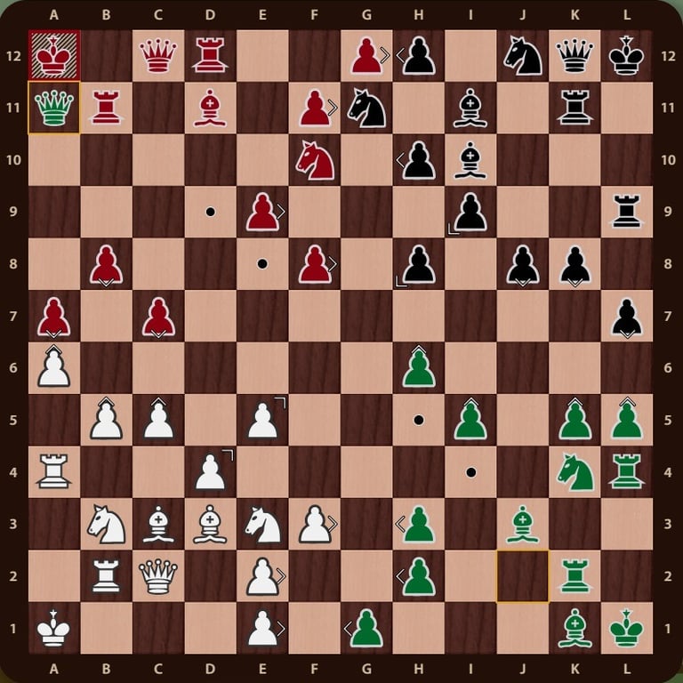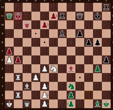 El rey rojo( no esta en jaque mate porque el ejercito negro esta inactivo y la torre de f12 no impide que el rey rojo pueda ir a la casilla b12) esta rodeado, falta un movimiento para completar el jaque mate, la reina verdeen c11 cubre la casilla de escape del rey rojo y completa el jaque mate