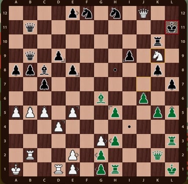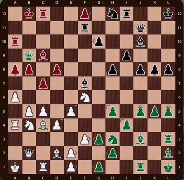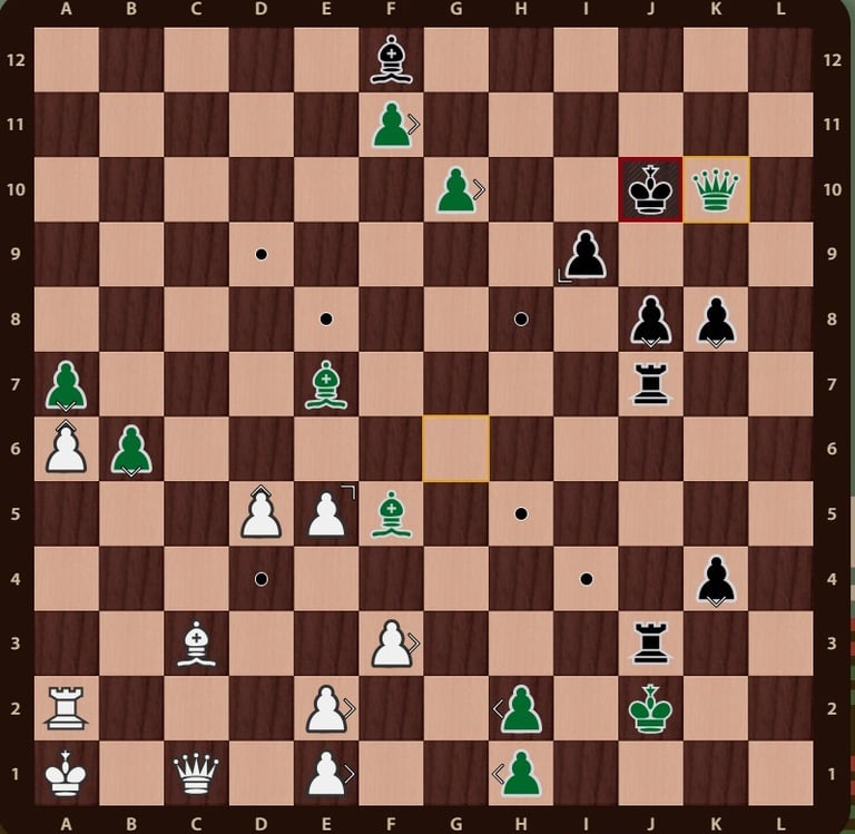 Mueven negras y su Rey está en jaque de rojas Ag7+. Lo natural en esta jugada es responder capturando el Alfil con el Caballo de i8 y amenaza resuelta, pero como en este juego hay más jugadores, blancas en su turno tiene amenaza de jaque mate a negras en L10. La mejor respuesta es mover el Rey a L11 (Rl12-l11) y controlar la casilla por donde puede llegar la Dama blanca De3-l10, anulando las dos amenazas, en una jugada.